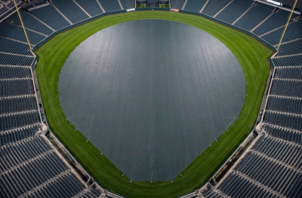 Rain is moving in, the game starts in 40 minutes, and the tarp crew is pulling a 160-pound vinyl cover across a wet infield under stadium lights. The cover gets down. The field is protected. But two workers are spent, a seam blew out at the third-base corner during last month’s rollout, and the cover shed its vibrant color two summers ago.